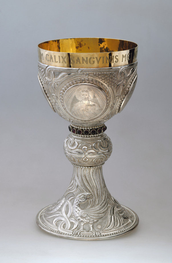 A másik kehely 2004-ben készült. A néhol aranyozott, egyébként teljes ezüst domborítás szintén gránátkővel van díszítve. A kuppakosár jelenetei: a Fájdalmas Krisztus (Fájdalmak férfija; Vir dolorum), kinek testét két angyal tartja meg, az utolsó vacsora, a keresztre feszített Krisztus és az áldó Krisztus. A talpon pedig ezekkel párhuzamosan, mintegy előképnek beállítva a tipológia szerint: Melkizedek áldozata, Ábrahám áldozata, a rézkígyó és a Jó Pásztor.
