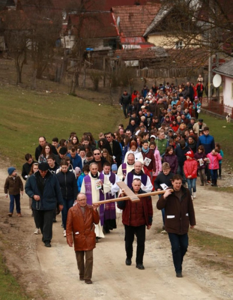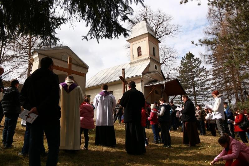 A rónaszékiek számára a Kálvária egy fontos pont. A búcsú napján is ide jövünk ki, sokszor elvégezzük a keresztutat. Jó, hogy ti is itt vagytok most, a nagyböjti felkészülési időben, amikor Krisztus keresztjére tekintünk, amikor lelkünket emeljük az ég felé, talán bűnbánóan is, mert értünk kellett Krisztusnak szenvednie a kereszten és meghalnia a Golgotán. Ha nem halt volna meg, mi nem lennénk keresztények, nem lettünk volna megváltva. Köszönjük a mennyei Atyának, hogy ilyen jóságos az emberek felé és megköszönjük Jézusnak is, hogy vállalta értünk az áldozatot. Nagyon boldog érzés az ember számára, amikor tudja, hogy válláról Isten levette a terhet. Milyen sokszor előfordul, hogy nem akarjuk felvenni a keresztet, milyen sokszor távol vagyunk a kereszttől... – hangsúlyozta Anderco Ottó.