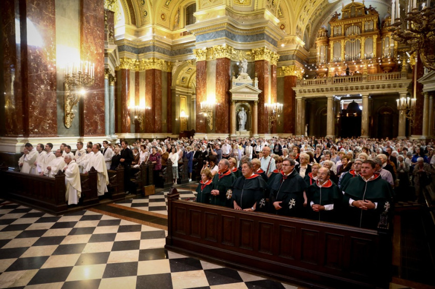 A mai szentmise végén megújítjuk hazánk felajánlását Jézus Szentséges Szívének. Ezt az imádságot alig eltérő formában már Vaszary Kolos prímás elmondta a millennium évében, 1915-ben pedig Csernoch János vezetésével püspöki karunk ajánlotta fel a háborútól és reménytelenségtől gyötört Magyarországot az isteni szívnek. Amikor most, száz év múltán megújítjuk ezt a felajánlást, mai fájdalmainkra, lelkiismeret-furdalásainkra és reményeinkre gondolunk. A több mint hatmillió abortuszra, az elöregedő társadalomra, arra, hogy népünk szinte hánykolódik azon a tengeren, amit a globális gazdaság és politika, az emberiség elemi erejű mozgásai viharként korbácsolnak. Hinnünk kell abban, hogy a mindenható Isten szemében értékesek vagyunk, hogy szeret minket. Csak így van értelme jószándékú igyekezetünknek, amely emberi mértékkel gyengének látszik, de ha Isten tervéhez igazodik, részese lehet a Mennyei Atya már köztünk lévő és az idők végén kiteljesedő országának, amelynek eljövetelét a Miatyánkban nap, mint nap kérjük.