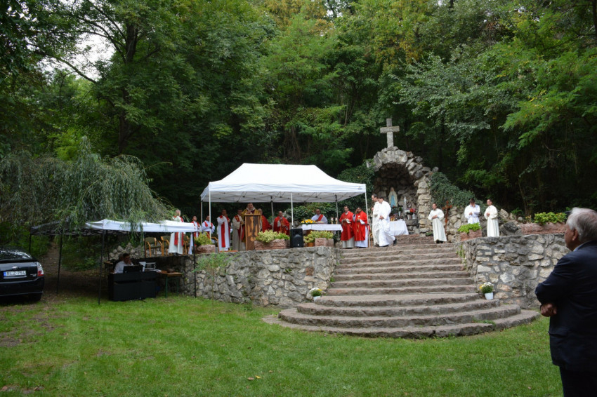 A Via Lucis felavatását és megáldását követően búcsúi szentmise volt a lourdes-i barlang melletti tisztáson, amelyet Ábrahám Béla előző tartományfőnök mutatott be, aki hosszú évekig volt Péliföldszentkereszt lakója, közösségének igazgatója, és ma is nagyon szívesen tér ide vissza.