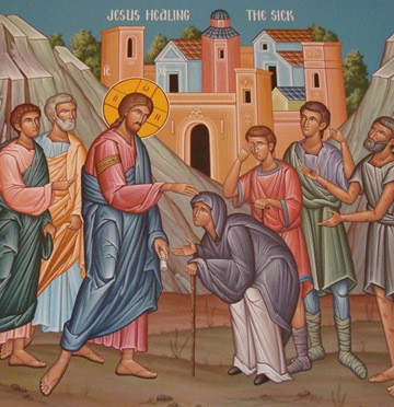 Jézus szombatonként a zsinagógában tanított. Volt ott egy asszony, akit a betegség lelke már tizennyolc éve hatalmában tartott. Annyira meggörnyedt, hogy egyáltalán nem tudott felegyenesedni. Amikor Jézus meglátta, magához hívta, és így szólt hozzá: „Asszony, megszabadultál betegségedtől.” Közben rátette a kezét. Az rögtön felegyenesedett, és dicsőítette az Istent. A zsinagóga elöljárója méltatlankodott azért, hogy Jézus szombaton gyógyított, és a sokasághoz fordult: „Hat napotok van a munkára. Akkor jöjjetek gyógyulást keresni, ne szombaton!” Jézus feléje fordult, és megfelelt neki: „Képmutatók! Van-e köztetek egy is, aki nem oldja el a jászoltól ökrét vagy szamarát szombati napon, hogy megitassa? Ábrahámnak ezt a lányát pedig a sátán tartotta megkötözve immár tizennyolc éve. Nem kellett-e őt feloldani kötelékétől akár szombaton is?” Ellenfelei e szavakra szégyenükben elpirultak. A nép pedig örvendezett, hogy Jézus ilyen csodát művelt.