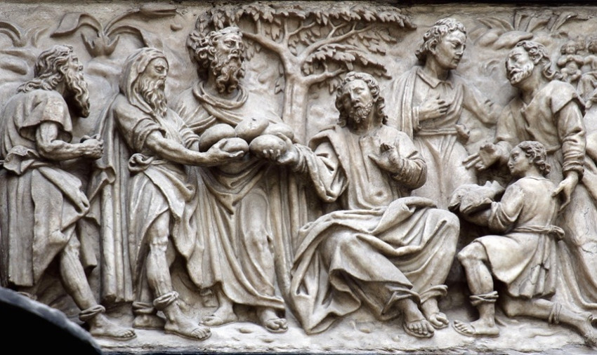 Amikor Jézus fölemelte szemét, és látta, hogy nagy tömeg jön feléje, így szólt Fülöphöz: „Honnan vegyünk kenyeret, hogy legyen mit enniük?” Ezt pedig azért kérdezte, hogy próbára tegye, mert ő tudta, hogy mit fog tenni. „Kétszáz dénár árú kenyér sem elég nekik, hogy mindenki kapjon valami keveset” – felelte Fülöp. Az egyik tanítvány, András, Simon Péter testvére megszólalt: „Van itt egy fiú, akinél öt kenyér és két hal van, de mi ez ennyinek?” Jézus meghagyta: „Telepítsétek le az embereket!” Sok fű volt azon a helyen. Letelepedtek hát: szám szerint mintegy ötezren voltak csupán a férfiak. Jézus pedig vette a kenyereket, hálát adott, és kiosztotta a letelepedett embereknek; ugyanígy (adott) a halból is, amennyit csak akartak. Amikor pedig jóllaktak, szólt tanítványainak: „Szedjétek össze a maradékot, hogy semmi se vesszen kárba.” Összeszedték, s tizenkét kosarat töltöttek meg az öt árpakenyér maradékából, amit meghagytak azok, akik ettek.