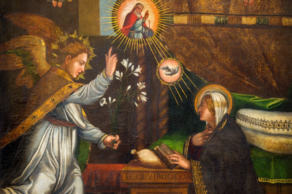 Az angyal belépett hozzá és így szólt: „Üdvöz légy, kegyelemmel teljes! Az Úr veled van! Áldottabb vagy te minden asszonynál!”