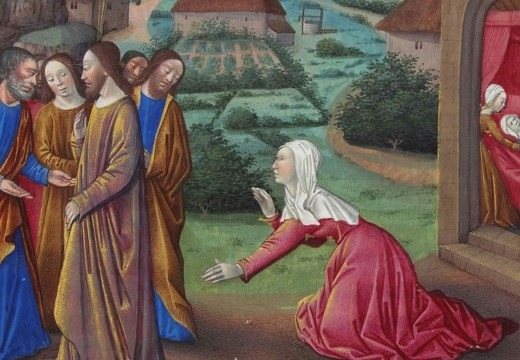Jézus kijelentette: „Az én küldetésem csak Izrael házának elveszett juhaihoz szól.” Ám az asszony odajött, és leborult előtte e szavakkal: „Uram, segíts rajtam!” Ő így válaszolt: „Nem való elvenni a gyerekek kenyerét és odadobni a kutyáknak!” Mire az asszony: „Igen, Uram, de a kutyák is esznek abból, ami lehull gazdájuk asztaláról!” Erre Jézus így szólt hozzá: „Asszony! Nagy a te hited! Legyen úgy, amint szeretnéd!” És a lánya meggyógyult még abban az órában.
