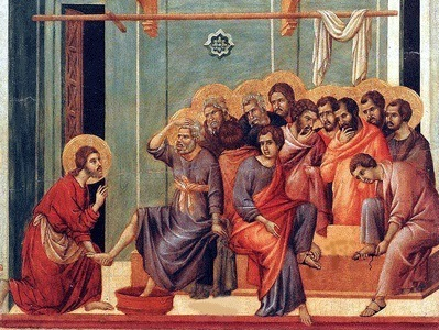 Húsvét ünnepe előtt történt. Jézus tudta, hogy elérkezett az óra, amikor ebből a világból vissza kell térnie az Atyához. Mivel szerette övéit, akik a világban voltak, még egy végső jelét adta szeretetének. Vacsora közben történt, amikor a sátán már fölébresztette Júdásnak, Karióti Simon fiának szívében a gondolatot, hogy árulja el őt. Jézus tudta, hogy az Atya mindent a kezébe adott, s hogy Istentől jött és Istenhez tér vissza. Fölkelt hát a vacsora mellől, letette felső ruháját, fogott egy vászonkendőt, és a derekára kötötte. Azután vizet öntött egy mosdótálba, és mosni kezdte tanítványainak a lábát, majd a derekára kötött kendővel meg is törölte.