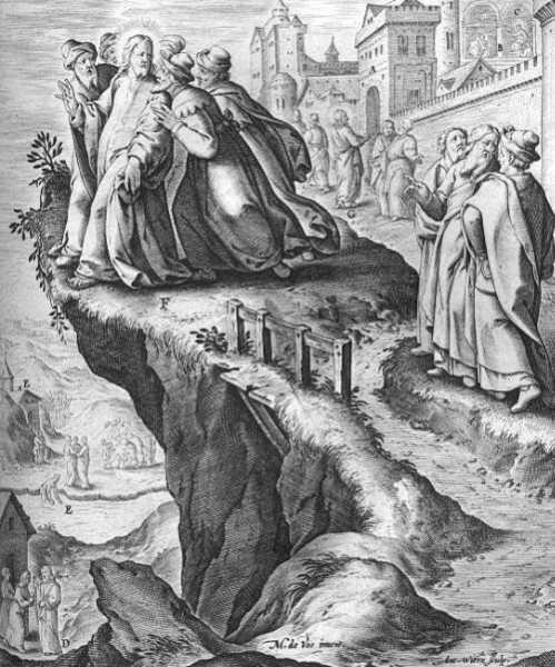 A názáreti zsinagógában Jézus így beszélt a néphez: „Bizony mondom nektek, hogy egy próféta sem kedves a maga hazájában. Igazán mondom nektek, sok özvegy élt Izraelben Illés idejében, amikor az ég három évre és hat hónapra bezárult, úgyhogy nagy éhínség támadt az egész Földön. De közülük egyikhez sem kapott Illés küldetést, csak a szidoni Száreptában élő özvegyasszonyhoz. Ugyanígy Elizeus próféta korában is sok leprás élt Izraelben, s egyikük sem tisztult meg, csak a szíriai Námán.” Ezt hallva, a zsinagógában mind haragra gerjedtek. Felugrottak, kiűzték Jézust a városon kívülre, és fölvezették arra a hegyre, amelyen városuk épült, a szakadék szélére, hogy letaszítsák. De ő áthaladt közöttük, és eltávozott.