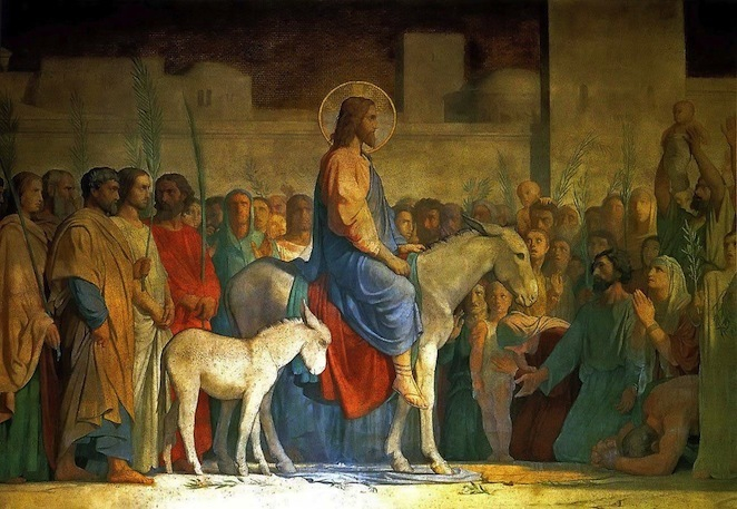 Miután ezeket mondta, haladt tovább Jeruzsálem felé. Amikor Betfagéhez és Betániához közeledett, ahhoz a hegyhez, amelyet Olajfák hegyének hívnak, elküldte két tanítványát ezekkel a szavakkal: „Menjetek a szemközti faluba. Amikor bementek, találtok ott megkötve egy szamárcsikót, amelyen még nem ült ember. Oldjátok el és vezessétek ide. Ha pedig valaki megkérdezi tőletek: »Miért oldjátok el?« – mondjátok neki: »Az Úrnak szüksége van rá.« A küldöttek elmentek, és mindent úgy találtak, amint megmondta nekik. Amikor eloldották a szamárcsikót, a gazdái megkérdezték tőlük: „Miért oldjátok el a szamárcsikót?” Ők azt felelték: „Az Úrnak szüksége van rá.” És elvitték Jézushoz. A szamárcsikóra ráterítették ruháikat, aztán fölültették rá Jézust.Amikor pedig elindult, az útra terítették ruháikat.Mikor már közel volt az Olajfák hegyének lejtőjéhez, a tanítványok egész csoportja elkezdte örvendezve, hangosan dicsérni Istent a sok csodáért, amelyet láttak.Ezt mondták: „Áldott a király, aki az Úr nevében jön! Békesség a mennyben és dicsőség a magasságban!” A tömegből néhány farizeus azt mondta neki: „Mester, intsd meg tanítványaidat!” Ő azonban ezt felelte nekik: „Mondom nektek: ha ezek elhallgatnak, a kövek fognak kiáltani!”