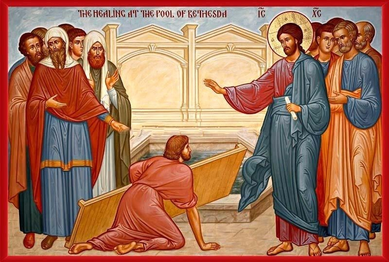 A húsvéti ünnepekre Jézus fölment Jeruzsálembe. Volt Jeruzsálemben az úgynevezett Juh-kapu mellett egy fürdő, amelyet héberül Beteszdának neveztek. Öt oszlopcsarnoka volt, ahol nagyon sok beteg feküdt: vakok, sánták és bénák. Volt ott egy harmincnyolc éve beteg ember is. Jézus látta, ahogy ott feküdt, és megtudta, hogy már régóta beteg. Megszólította: „Akarsz-e meggyógyulni?” A beteg azt felelte: „Uram! Nincs emberem, aki levinne a fürdőbe, amikor mozgásba jön a víz. Mire én odaérek, már más lép be előttem.” Jézus erre azt mondta neki: „Kelj föl, vedd ágyadat, és járj!” Az ember azonnal meggyógyult. Fölvette ágyát, és járni kezdett. Aznap éppen szombat volt. A zsidók ezért rászóltak a meggyógyított emberre: „Szombat van; nem szabad az ágyadat vinned.” Ő azonban így válaszolt nekik: „Aki meggyógyított, azt mondta nekem: Vedd ágyadat, és járj!” Megkérdezték tőle: „Kicsoda az az ember, aki azt mondta neked, hogy vedd ágyadat, és járj?” A meggyógyult ember azonban nem tudta, hogy ki volt az. Jézus ugyanis továbbment, amikor tömeg verődött össze a helyszínen. Később Jézus a templomban találkozott a meggyógyított emberrel, és ezt mondta neki: „Látod, most meggyógyultál. Többé ne vétkezzél, hogy valami nagyobb bajod ne essék!” Az ember elment, és elmondta a zsidóknak, hogy Jézus volt az, aki meggyógyította őt. A zsidók üldözték Jézust, mert mindezt szombaton cselekedte.