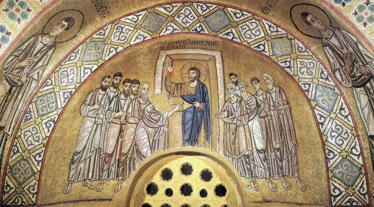 Amikor a hét első napján beesteledett, Jézus megjelent a tanítványoknak ott, ahol együtt voltak, pedig a zsidóktól való félelmükben zárva tartották az ajtót. Belépett, és így szólt hozzájuk: „Békesség nektek!” Miután ezt mondta, megmutatta nekik a kezét és az oldalát. Az Úr láttára öröm töltötte el a tanítványokat. Jézus megismételte: „Békesség nektek! Amint engem küldött az Atya, úgy küldelek én is titeket.” E szavak után rájuk lehelt, és így folytatta: „Vegyétek a Szentlelket! Akinek megbocsátjátok bűneit, az bocsánatot nyer, s akinek nem bocsátjátok meg, az nem nyer bocsánatot.”