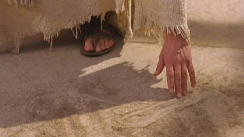 Jézus lehajolt, és az ujjával írni kezdett a földön. Ők azonban tovább faggatták. Erre fölegyenesedett, és azt mondta nekik: „Az vesse rá az első követ, aki közületek bűn nélkül van!” Aztán újra lehajolt, s tovább írt a földön. Azok meg ennek hallatára egymás után eloldalogtak, kezdve a véneken, s csak Jézus maradt ott a középen álló asszonnyal.