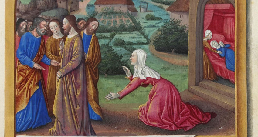 Jézus kijelentette: „Az én küldetésem csak Izrael házának elveszett juhaihoz szól.” Ám az asszony odajött, és leborult előtte e szavakkal: „Uram, segíts rajtam!” Ő így válaszolt: „Nem való elvenni a gyerekek kenyerét és odadobni a kutyáknak!” Mire az asszony: „Igen, Uram, de a kutyák is esznek abból, ami lehull gazdájuk asztaláról!” Erre Jézus így szólt hozzá: „Asszony! Nagy a te hited! Legyen úgy, amint szeretnéd!” És a lánya meggyógyult még abban az órában.
