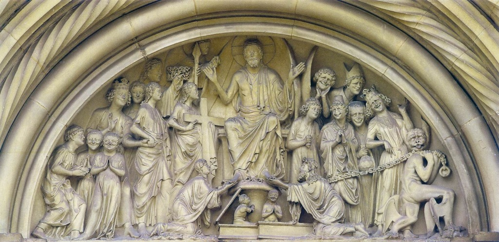 Az utolsó ítélet ábrázolása a bambergi dóm Fejedelmi kapujának timpanonján – Középkori német szobrász alkotása (1225–37)
