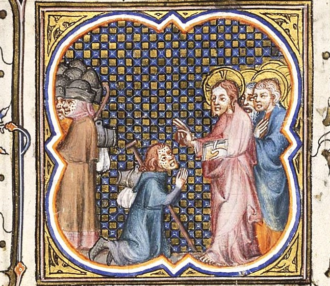 Jézus egyszer útban Jeruzsálem felé áthaladt Szamaria és Galilea határvidékén. Amikor betért az egyik faluba, tíz leprás férfi jött vele szembe. Még messze voltak, amikor már megálltak, és hangosan így kiáltottak: Jézus, Mester! Könyörülj rajtunk!” Ő rájuk tekintett, és így szólt hozzájuk: „Menjetek és mutassátok meg magatokat a papoknak.” Útközben megtisztultak.