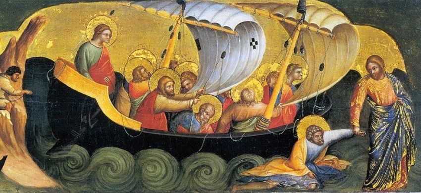 Éjszaka a negyedik őrváltás idején Jézus elindult feléjük a víz színén járva. Amikor észrevették, azt hitték, hogy kísértet, és rémületükben felkiáltottak. De Jézus azonnal megszólította őket: „Bátorság! Én vagyok! Ne féljetek!” Erre Péter odaszólt neki: „Uram, ha te vagy az, parancsold meg, hogy hozzád menjek a vízen!” Ő azt mondta: „Jöjj!” Péter ki is szállt a csónakból, elindult a vízen, és ment Jézus felé. De az erős szél láttán megijedt, és merülni kezdett. Felkiáltott: „Ments meg, Uram!” Jézus nyomban kinyújtotta kezét, megfogta őt, és így szólt hozzá: „Te kicsinyhitű, miért kételkedtél?” Mikor beszálltak a bárkába, a szél elállt. A csónakban levők pedig leborultak előtte, és így szóltak: „Te valóban az Isten Fia vagy!”