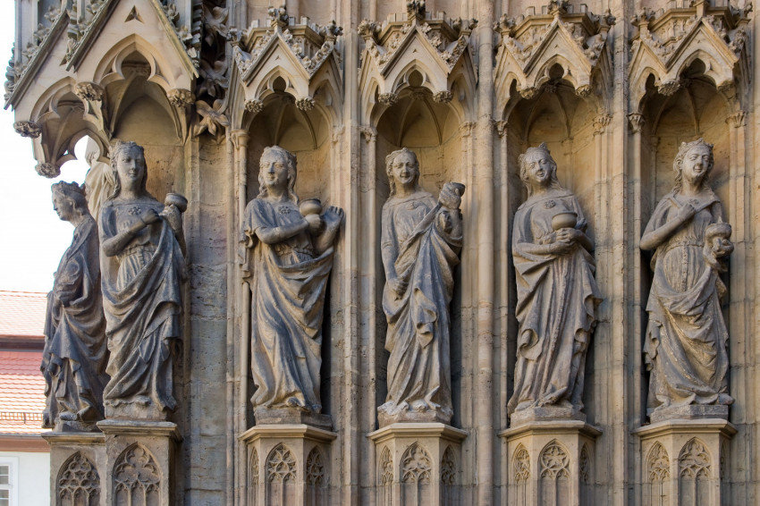 A mennyek országa olyan, mint az a tíz szűz, akik vették lámpáikat, és kimentek a vőlegény elé. Öten közülük balgák voltak, öten pedig okosak. A balgák fogták a lámpásukat, de olajat nem vittek magukkal; az okosak azonban korsóikban olajat is vittek lámpásaikhoz. Késett a vőlegény, s ők mind elálmosodtak és elaludtak. Az éjszaka közepén egyszerre kiáltás hangzott: „Íme, a vőlegény! Menjetek eléje!” Erre a szüzek mindnyájan fölébredtek, és felszították lámpásaikat. A balgák kérték az okosakat: „Adjatok az olajotokból, mert lámpásaink kialvóban vannak!” Az okosak ezt válaszolták: „Nem lehet, nehogy nekünk is, nektek is kevés legyen. Inkább menjetek el a kereskedőkhöz, és vegyetek magatoknak!” Míg azok vásárolni mentek, megérkezett a vőlegény, és akik készen voltak, bementek vele a menyegzőre; az ajtó pedig bezárult. Később megérkezett a többi szűz is. Így szóltak: „Uram, uram! Nyiss ajtót nekünk!” De ő így válaszolt: „Bizony mondom nektek, nem ismerlek titeket!” Virrasszatok tehát, mert nem ismeritek sem a napot, sem az órát!