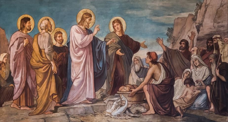 Mindezek után Jézus Galilea, azaz Tibériás tengerén túlra ment. Nagy sokaság követte őt, mert látták a csodajeleket, amelyeket a betegeken művelt. Jézus fölment a hegyre, és leült ott tanítványaival. Közel volt a Húsvét, a zsidók ünnepe. Amikor Jézus fölemelte szemét és látta, hogy nagy sokaság közeledik hozzá, megkérdezte Fülöptől: »Honnan veszünk kenyeret, hogy ehessenek?« Ezt pedig azért mondta, hogy próbára tegye őt, mert ő maga tudta, mit akar tenni. Fülöp azt felelte neki: »Kétszáz dénár árú kenyér sem elég nekik, hogy mindegyiknek csak valami kevés jusson.« A tanítványok egyike, András, Simon Péter testvére így szólt: »Van itt egy fiú, akinek van öt árpakenyere és két hala. De mi ez ennyinek?« Jézus erre azt mondta: »Telepítsétek le az embereket!« Sok fű volt azon a helyen. Letelepedtek tehát; a férfiak szám szerint mintegy ötezren voltak. Jézus pedig fogta a kenyereket, hálát adott, és szétosztotta a letelepülteknek. Ugyanígy a halakból is adott, amennyit akartak. Miután jóllaktak, azt mondta tanítványainak: »Szedjétek föl a megmaradt darabokat, hogy semmi el ne vesszen!« Összeszedték tehát, és az öt árpakenyér darabjaiból, ami megmaradt az étkezők után, tizenkét kosarat töltöttek meg. Az emberek pedig, látva a csodajelet, amelyet művelt, azt mondták: »Bizonyára ez az a próféta, aki eljön a világra!« Amikor Jézus észrevette, hogy arra készülnek, hogy megragadják és királlyá tegyék, ismét visszavonult a hegyre, egészen egyedül.