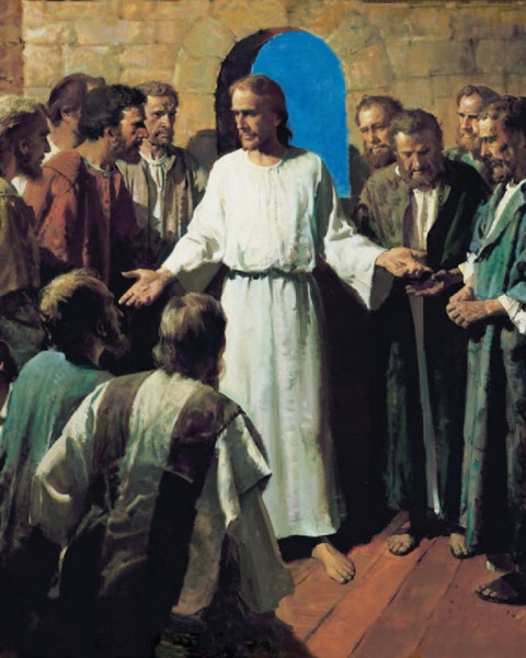 Abban az időben az Emmauszból visszatért tanítványok beszámoltak az úton történtekről, meg arról, hogyan ismerték fel Jézust a kenyértöréskor. Míg ezekről beszélgettek, egyszer csak megjelent köztük (Jézus), és köszöntötte őket: „Békesség nektek!” Ijedtükben és félelmükben azt vélték, hogy szellemet látnak. De ő így szólt hozzájuk: „Miért ijedtetek meg, és miért támad kétely a szívetekben? Nézzétek meg kezemet és lábamat! Én vagyok. Tapintsatok meg és lássátok, a szellemnek nincs húsa és csontja, de amint látjátok, nekem van.” Ezután megmutatta nekik a kezét és a lábát. De örömükben még mindig nem mertek hinni, és csodálkoztak. Ezért így szólt hozzájuk: „Van itt valami ennivalótok?” Adtak neki egy darab sült halat. Fogta és a szemük láttára evett belőle. Aztán így szólt hozzájuk: „Ezeket mondtam nektek, amikor még veletek voltam. Be kell teljesednie mindannak, amit rólam Mózes törvényében, a prófétákban és a zsoltárokban írtak.” Ekkor megnyitotta értelmüket, hogy megértsék az írásokat. Majd így folytatta: „Meg van írva, hogy a Messiásnak szenvednie kell, és harmadnap fel kell támadnia a halálból. Nevében megtérést és bűnbocsánatot kell hirdetni Jeruzsálemtől kezdve minden népnek. Ti tanúi vagytok ezeknek.”