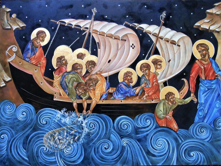 Amikor (a kenyérszaporítás után) mindnyájan ettek és jóllaktak, Jézus mindjárt megparancsolta tanítványainak, hogy szálljanak csónakba, menjenek át előtte a túlsó partra, miközben ő elbocsátja a tömeget. Amint elbocsátotta az embereket, fölment a hegyre, hogy egyedül imádkozzék. Közben beesteledett, és ő ott volt egymagában. A csónak pedig már jó pár stádiumnyira eltávolodott a parttól. Hányták-vetették a hullámok, mert ellenszél fújt. Éjszaka a negyedik őrváltás idején Jézus elindult feléjük a víz színén járva. Amikor észrevették, azt hitték, hogy kísértet, és rémületükben felkiáltottak. De Jézus azonnal megszólította őket: „Bátorság! Én vagyok! Ne féljetek!” Erre Péter odaszólt neki: „Uram, ha te vagy az, parancsold meg, hogy hozzád menjek a vízen!” Ő azt mondta: „Jöjj!” Péter ki is szállt a csónakból, elindult a vízen, és ment Jézus felé. De az erős szél láttán megijedt, és merülni kezdett. Felkiáltott: „Ments meg, Uram!” Jézus nyomban kinyújtotta kezét, megfogta őt, és így szólt hozzá: „Te kicsinyhitű, miért kételkedtél?”
