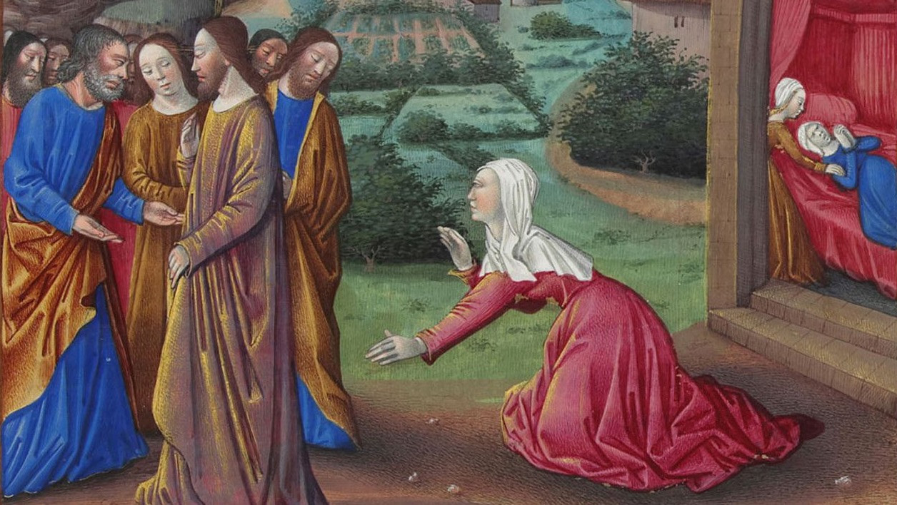 Jézus kijelentette: „Az én küldetésem csak Izrael házának elveszett juhaihoz szól.” Ám az asszony odajött, és leborult előtte e szavakkal: „Uram, segíts rajtam!” Ő így válaszolt: „Nem való elvenni a gyerekek kenyerét és odadobni a kutyáknak!” Mire az asszony: „Igen, Uram, de a kutyák is esznek abból, ami lehull gazdájuk asztaláról!” Erre Jézus így szólt hozzá: „Asszony! Nagy a te hited! Legyen úgy, amint szeretnéd!” És a lánya meggyógyult még abban az órában.