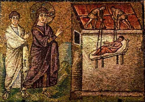 Néhány nap múlva Jézus visszatért Kafarnaumba. Mihelyt elterjedt a híre, hogy otthon van, annyian jöttek össze, hogy még az ajtó előtti téren sem fértek el; ő pedig hirdette nekik az igét. Közben odahoztak hozzá egy bénát. Négyen vitték. Mivel a tömegtől nem fértek a közelébe, kibontották fölötte a tetőt, ahol volt, és a nyíláson át leengedték a hordágyat, amelyen a béna feküdt. Jézus pedig, látva hitüket, így szólt a bénához: „Fiam, bocsánatot nyertek bűneid.”