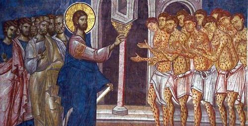 Jézus egyszer útban Jeruzsálem felé áthaladt Szamaria és Galilea határvidékén. Amikor betért az egyik faluba, tíz leprás férfi jött vele szembe. Még messze voltak, amikor megálltak, és hangosan így kiáltottak: „Jézus, Mester! Könyörülj rajtunk!” Ő rájuk tekintett, és így szólt hozzájuk: „Menjetek és mutassátok meg magatokat a papoknak.” Útközben megtisztultak. Az egyik, amikor észrevette, hogy meggyógyult, visszament, hangos szóval dicsőítette Istent, arcra borult Jézus lába előtt, és hálát adott neki. És ez az ember szamaritánus volt. Jézus megkérdezte: „Nemde tízen tisztultak meg? Hol maradt a többi kilenc? Nem akadt más, aki visszajött volna, hogy hálát adjon Istennek, csak ez az idegen?” Aztán hozzá fordult: „Kelj fel és menj! Hited meggyógyított téged.”