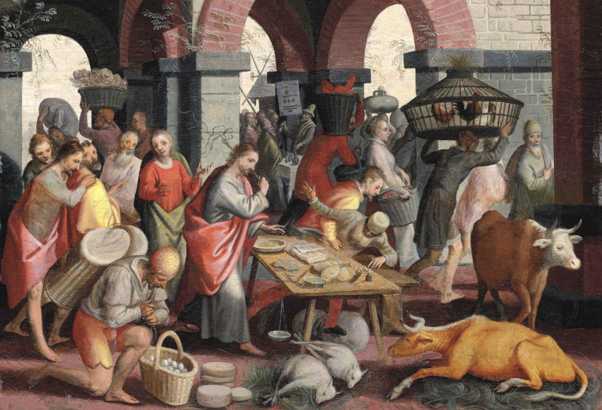 Abban az időben mivel közel volt a zsidók húsvétja, Jézus fölment Jeruzsálembe. A templomban árusokat talált, akik ökröt, juhot és galambot árultak, valamint pénzváltókat, akik ott ültek. Ekkor kötelekből ostort font, és kikergette mindnyájukat a templomból, ugyanígy a juhokat és az ökröket is, a pénzváltók pénzét pedig szétszórta. Az asztalokat felforgatta, a galambárusoknak meg azt mondta: „Vigyétek innét ezeket, ne tegyétek Atyám házát vásárcsarnokká!” Tanítványainak eszébe jutott, hogy írva van: „Emészt a házadért való buzgóság.”