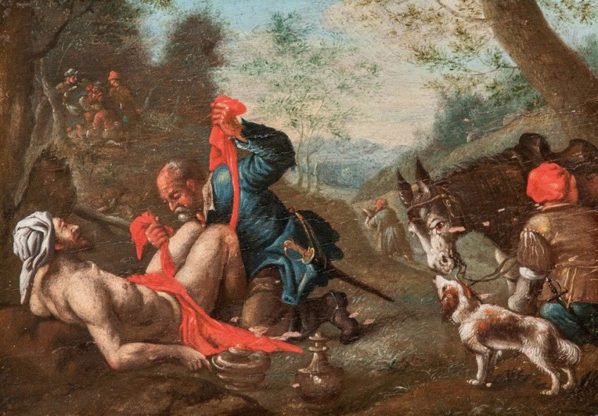 Válaszul Jézus ezt mondta neki: „Történt, hogy egy ember Jeruzsálemből lement Jerikóba. Rablók kezébe került. Ezek kifosztották, véresre verték, és félholtan otthagyták. Egyszer csak egy pap jött lefelé az úton. Észrevette, de elment mellette. Azután egy levita jött arra. Ő is meglátta, de elment mellette. Végül egy szamaritánusnak is arra vitt az útja. Amikor megpillantotta, megesett rajta a szíve. Odament hozzá, olajat és bort öntött sebeire, és bekötözte, majd pedig felültette teherhordó állatára, elvitte egy vendégfogadóba és gondoskodott róla. Másnap elővett két dénárt, odaadta a fogadósnak ezzel a kéréssel: »Viseld gondját, és ha többet költenél rá, visszatérve megadom neked.«