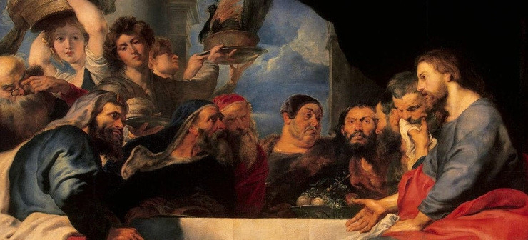 Ekkor a házigazdához fordult: „Amikor ebédet vagy vacsorát adsz, ne hívd meg barátaidat, se testvéreidet, se rokonaidat, se gazdag szomszédaidat, mert azok is meghívnak és viszonozzák neked. Ha lakomát adsz, hívd meg a szegényeket, bénákat, sántákat, vakokat. Boldog leszel, mert ők nem tudják neked viszonozni. Te azonban az igazak feltámadásakor megkapod jutalmadat.”