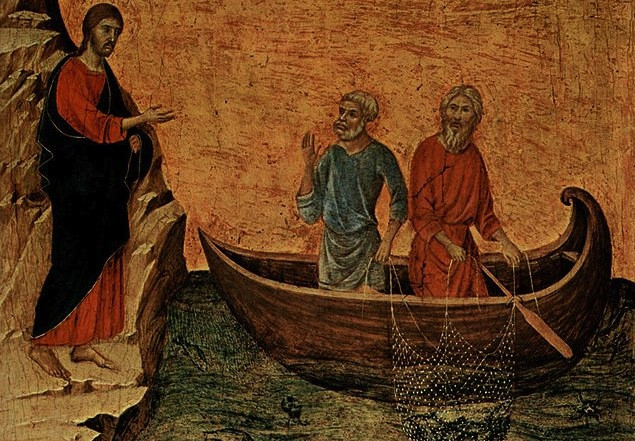 A Galileai-tenger mentén járva meglátott két testvért: Simont, akit Péternek is neveznek, és Andrást, a testvérét. Éppen hálót vetettek a tengerbe, mert halászok voltak. Így szólt hozzájuk: „Kövessetek engem, és én emberek halászává teszlek titeket!” Erre azok otthagyták hálóikat és követték őt. Amint onnan továbbment, meglátott másik két testvért is: Zebedeus fiát, Jakabot és testvérét, Jánost. Apjukkal, Zebedeussal a hálóikat javították a csónakban. Őket is elhívta. Ők is otthagyták a csónakot és az apjukat, és követték őt. Jézus pedig bejárta egész Galileát. Tanított a zsinagógákban, hirdette a mennyek országa örömhírét, és meggyógyított a nép körében minden betegséget és minden gyötrelmet.