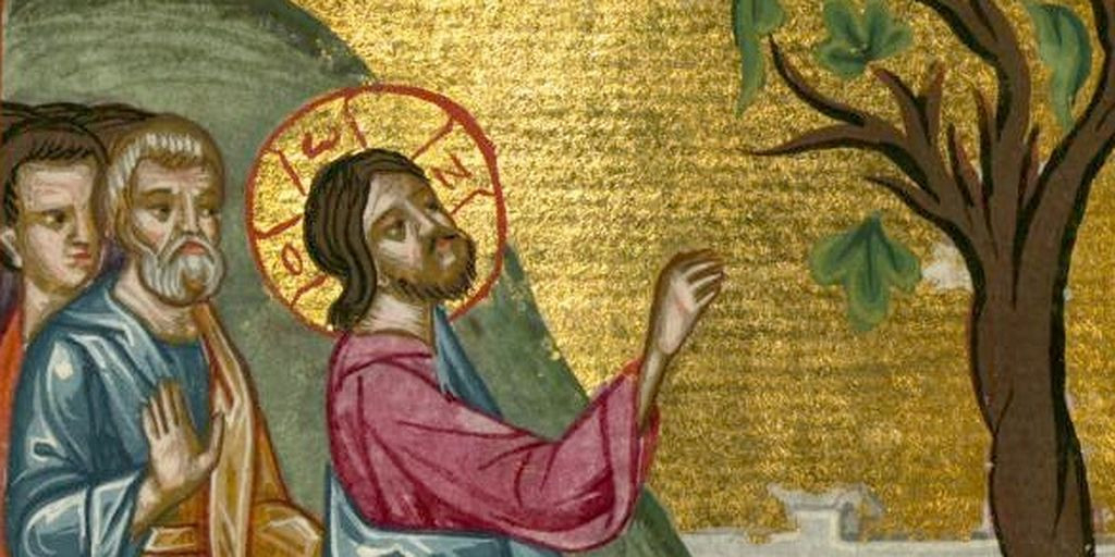 Miután Jézus a tömeg örömujjongása közben bevonult Jeruzsálembe, fölment a templomba. Ott körülnézett, és mindent szemügyre vett. Mivel már esteledett, a tizenkét apostollal együtt kiment Betániába. Amikor másnap eljöttek Betániából, Jézus megéhezett. Messziről látott egy zöldellő fügefát. Elindult feléje, hátha talál rajta valami gyümölcsöt. De amikor odaért, csak leveleket talált rajta, mert még nem érkezett el a fügeérés ideje. Ekkor így szólt: „Senki se egyék rólad gyümölcsöt soha többé!” Tanítványai is hallották ezt.