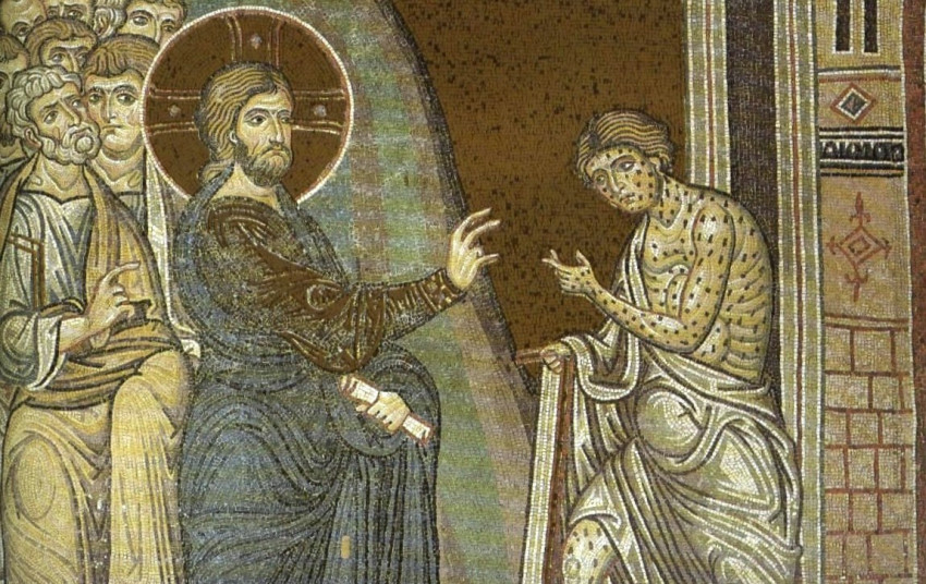 Amikor Jézus befejezte a hegyi beszédet és lejött a hegyről, nagy sokaság követte. Ekkor odament hozzá egy leprás, leborult előtte, és így kérlelte: „Uram, ha akarod, megtisztíthatsz engem.” Jézus kinyújtotta kezét, megérintette őt, és így szólt: „Akarom, tisztulj meg!” Erre a leprás azonnal megtisztult. Akkor Jézus így szólt hozzá: „Nézd, ne mondd el ezt senkinek se, hanem menj, mutasd meg magadat a papnak, és ajánld föl azt az áldozatot, amelyet Mózes rendelt, bizonyságul a gyógyulásról!”