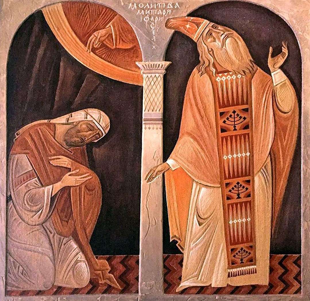 Abban az időben az elbizakodottaknak, akik magukat igaznak tartották, másokat pedig megvetettek, Jézus ezt a példabeszédet mondta: „Két ember fölment a templomba imádkozni, az egyik farizeus volt, a másik vámos. A farizeus megállt, és így imádkozott magában: »Istenem, hálát adok neked, hogy nem vagyok olyan, mint a többi ember, rabló, igazságtalan, házasságtörő, mint ez a vámos is. Kétszer böjtölök hetenként, és tizedet adok mindenből, amim van.« A vámos pedig távolabb állt meg, és a szemét sem merte az égre emelni, hanem a mellét verve így szólt: »Istenem, légy irgalmas nekem, bűnösnek!«