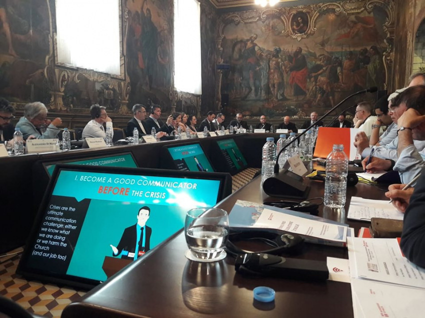 Angelo Bagnasco bíboros, genovai érsek, a CCEE elnöke megnyitóbeszédében alapos és reális képet adott az Egyházat napjainkban érintő krízisekről (kiskorúak bántalmazása, migráció, értékvesztettség stb.), és az evangéliumi élet radikalitására hívta a sajtó képviselőit. Kiemelte, hogy a krisztusi szeretet gyakorlása nélkül csak egy olyan szervezet lesz a Katolikus Egyház, amely karitatív célokat valósít meg.