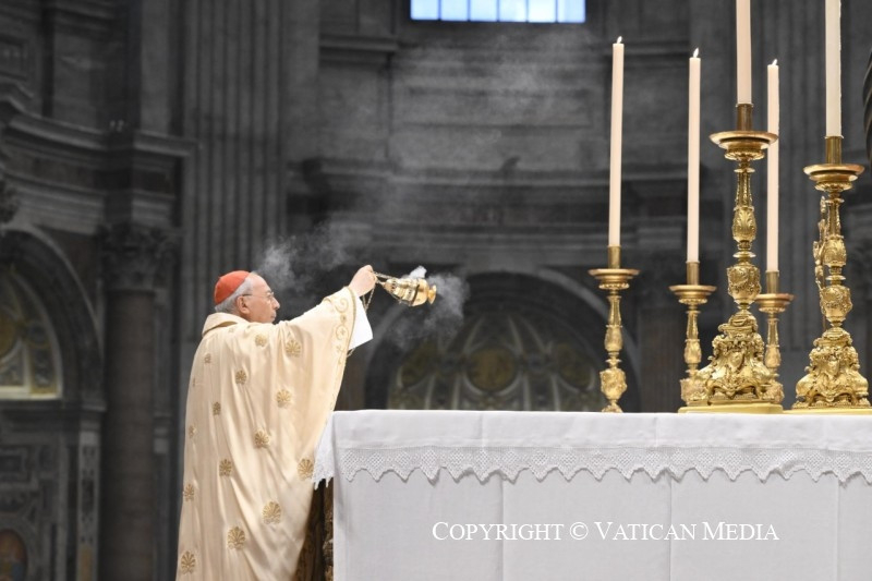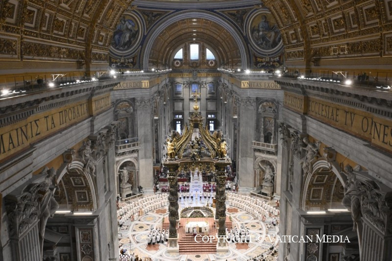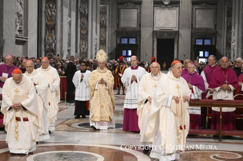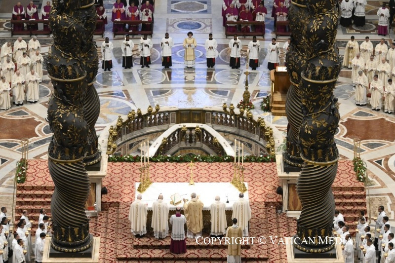A Jelenések könyvéből vett szentleckében (vö. Jel 5,11–14) hallottuk azt a dicsőítést, amelyet az egész világegyetem zeng a trónon ülőnek és a Báránynak: „»Áldás, tisztelet, dicsőség és hatalom örökkön örökké!« A négy élőlény így felelt: »Ámen«, a vének pedig leborultak és imádták” (Jel 5,13–14).