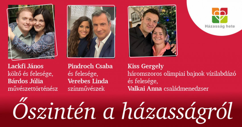 A február 16-i, szerdai program – Őszintén a házasságról – Páratlan beszélgetés közismert párokkal – színhelye az ELTE ÁJK Aula Magna terme, innen követhetjük majd 18 órától a közösségi média szokásos felületén online formában is Lackfi János költő és felesége, Bárdos Júlia művészettörténész, a Pindroch Csaba és Verebes Linda színművész-házaspár, valamint Kiss Gergely háromszoros olimpiai bajnok vízilabdázó és felesége, Valkai Anna családmenedzser beszélgetését Mohay Bence sportriporter moderálásával.