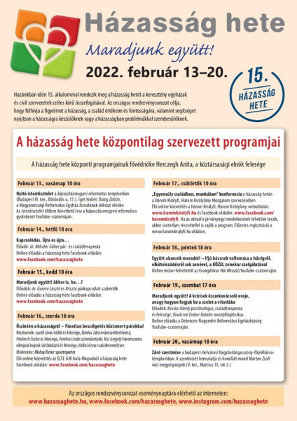 Az idén a „Maradjunk együtt!” mottóval megrendezett házasság hete központi programsorozata február 13-án délelőtt 10 órakor ünnepi istentisztelettel veszi kezdetét Budapesten a káposztásmegyeri református templomban (Budapest, IV. kerület, Bőröndös u. 17.), ahol Balog Zoltán, a Magyarországi Református Egyház Zsinatának lelkészi elnöke hirdet igét. (Az istentisztelet élőben követhető lesz a Káposztásmegyeri Református Gyülekezet YouTube-csatornáján.)