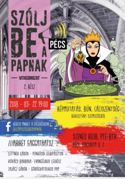 Március 22-én 19 órától Pécsett, a Szenes Klubban (Pacsirta utca 2.) ezúttal a képmutatásról, a bűnről és (ál)szentségről lesz szó, keresztény szemszögből. Kovács Barbara evangélikus lelkészt, Lettner Gábor pünkösdi lelkipásztort és Zajácz Gábor görögkatolikus papot lehet majd kérdezni.