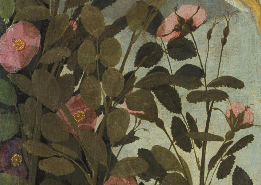 Ha jobban megfigyeljük a festményt, akkor láthatjuk, hogy a Máriát és Jézust körülvevő virágok rózsák; ez szintén mélyebb mondanivalót hordoz. A rózsa egyszerre Mária és Jézus jelképe is. A Szűzanyát egyes hagyományokban rosa mysticának nevezik, vagyis tövis nélküli rózsának, amelyet Isten megőrzött az áteredő bűntől. A rózsaszín az öröm és szeretet jelképe, míg a kék Isten jelenlétét szimbolizálja.