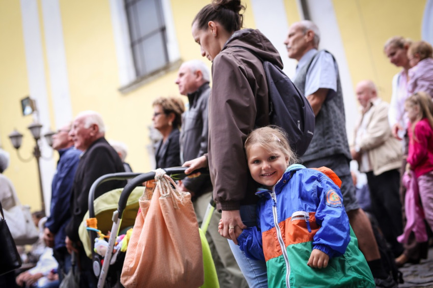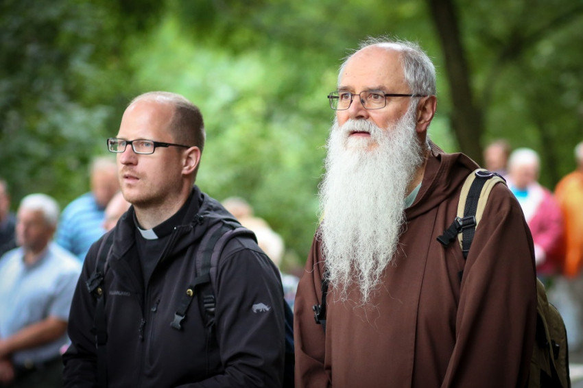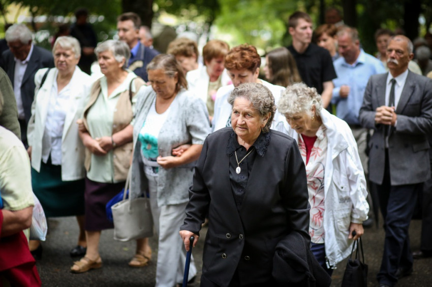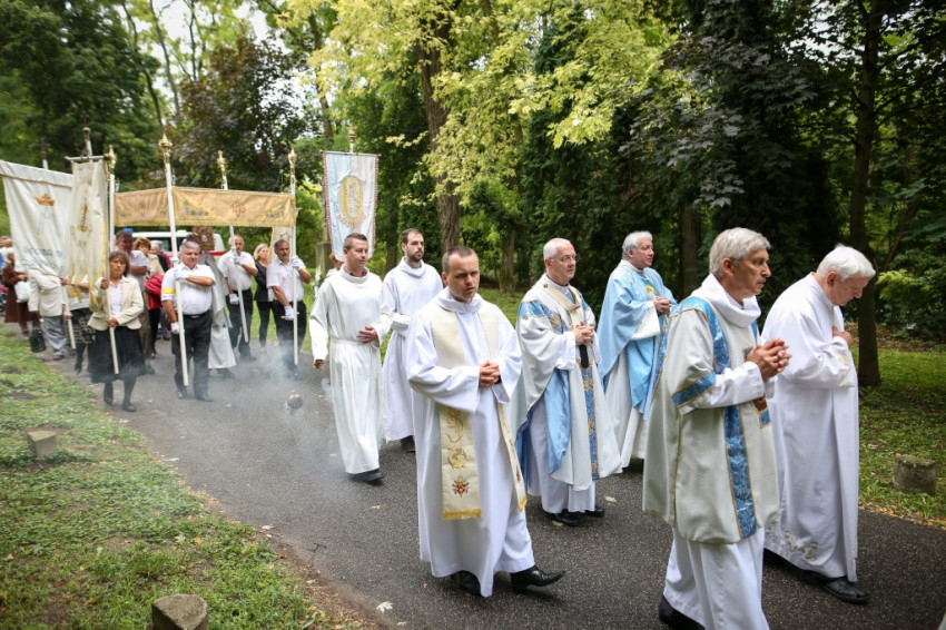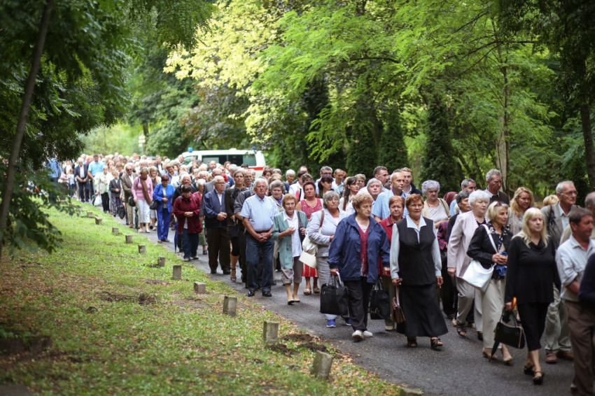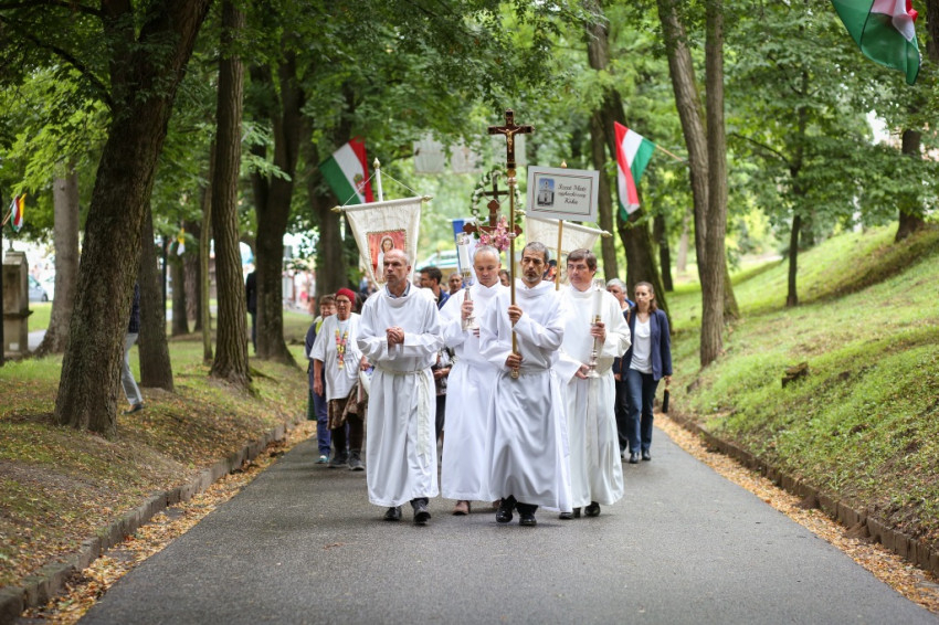 A felajánló ima befejeztével indult el a körmenet. Elöl a templom keresztjét hordozók, aztán a máriás lányok – Szűz Mária szobrával, majd a papság, a főcelebráns érsek és a baldachin alatt az Oltáriszentség. A körmenetben százak és százak vonultak énekelve, imádkozva, hogy a szabadtéri oltárhoz visszatérve, a máriás énekeket követően elénekeljék a pápai és a magyar himnuszt.