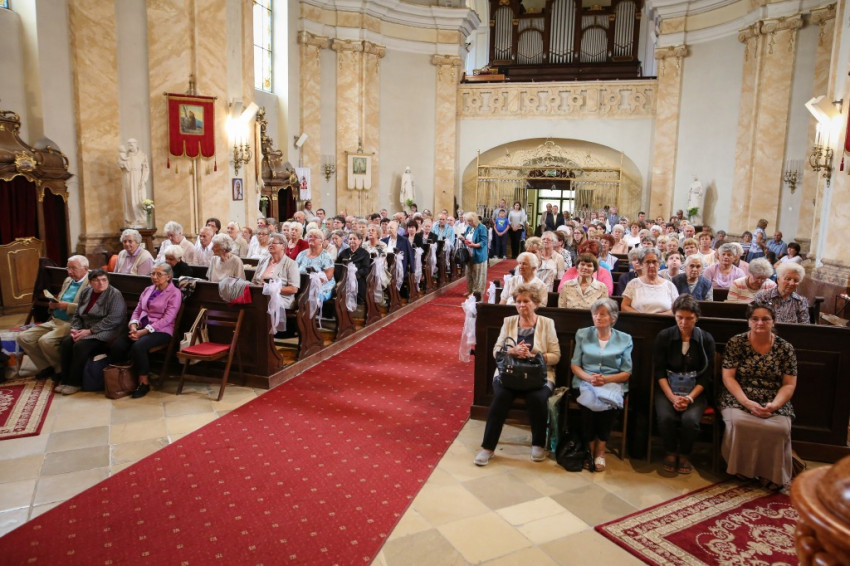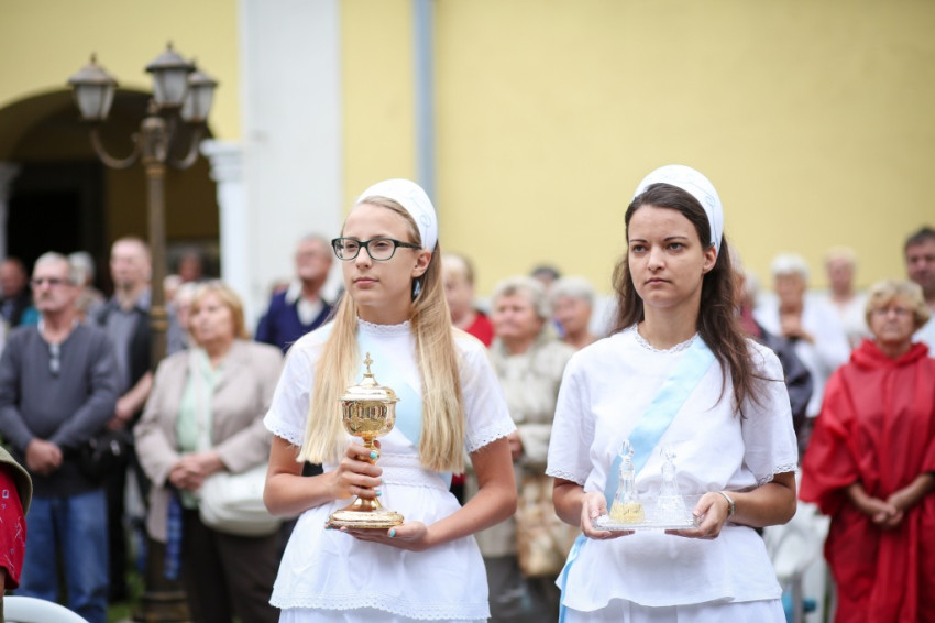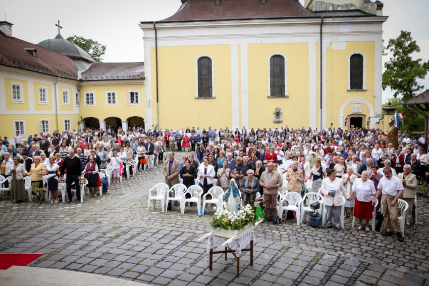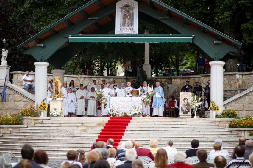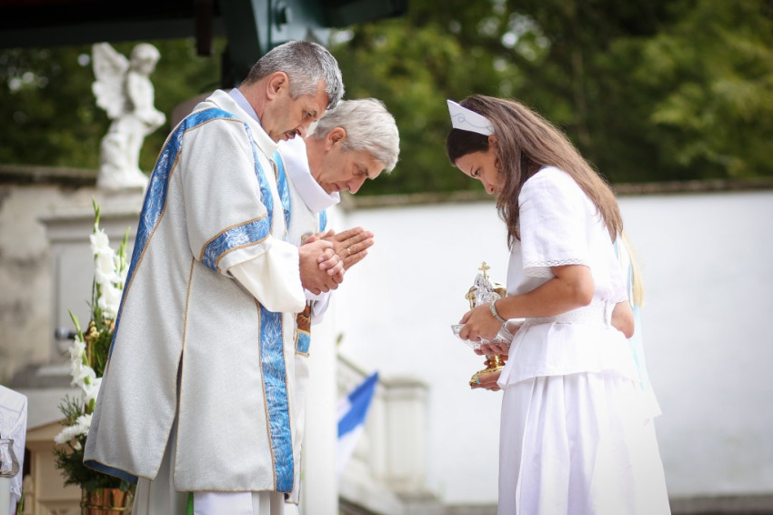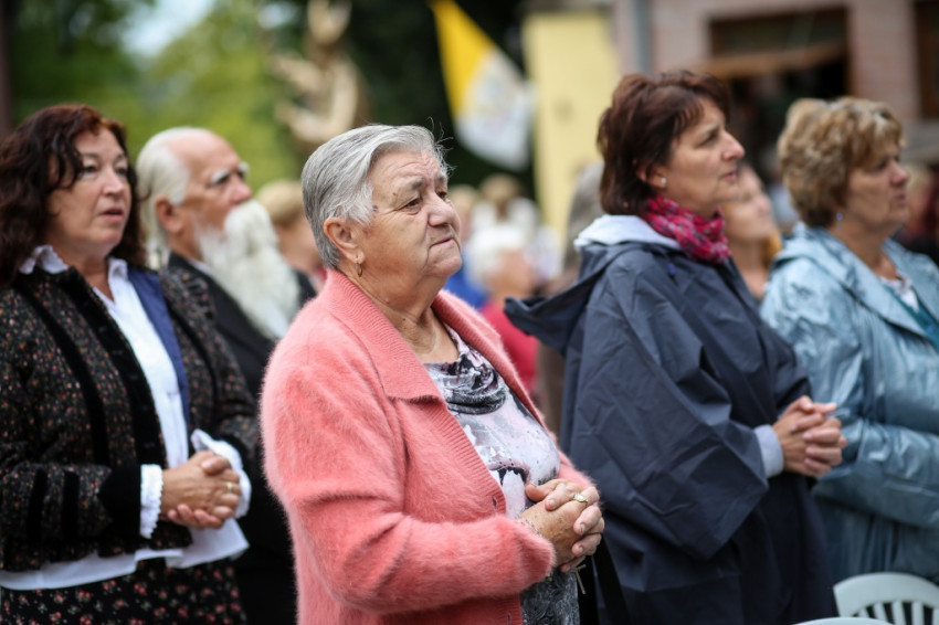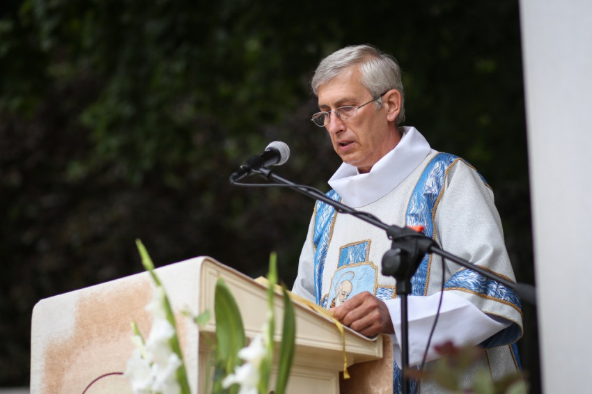 Miután a templomból a szabadtéri oltárhoz vonult az asszisztencia, legelöl a templom keresztjével, mögöttük a máriás lányok Szűz Mária szobrával és a koncelebráló papság, Stella Leontin, a bazilika plébánosa köszöntötte a megjelenteket.