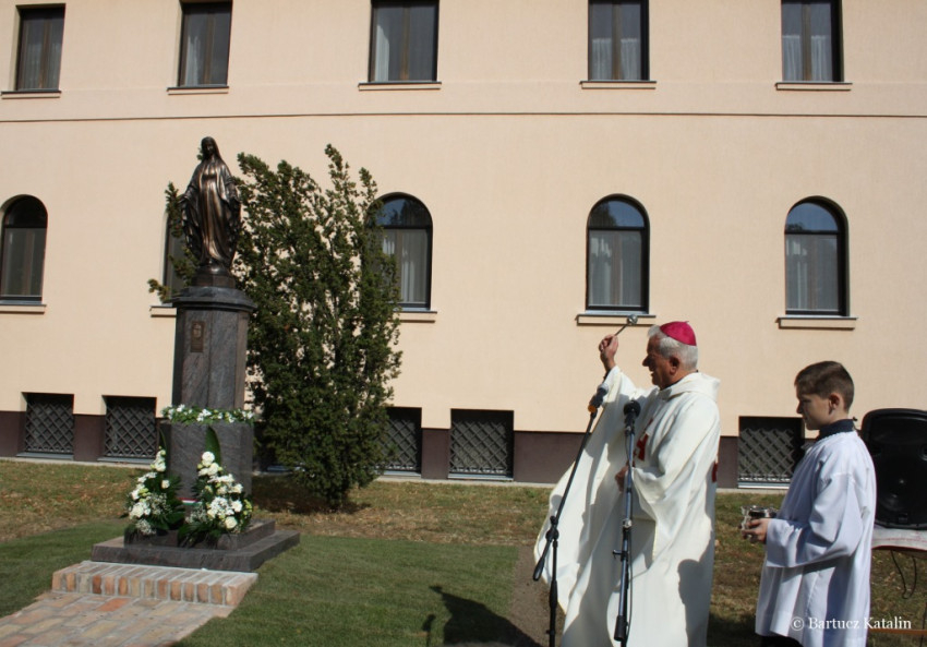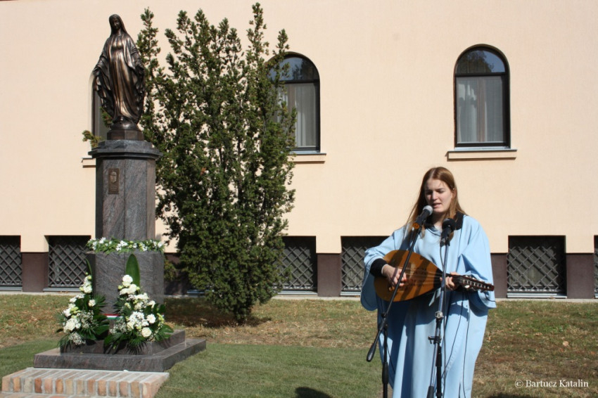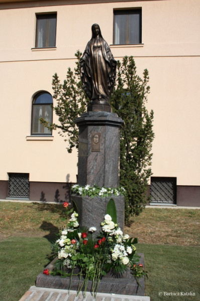 A szobor talapzatán az alábbi felirat olvasható: „Magyarok Nagyasszonya, könyörögj érettünk!”