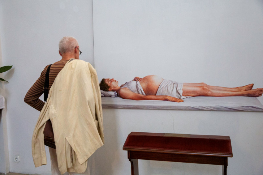 Czene Mártát – saját bevallása szerint – már régóta foglalkoztatta a kompozíció, amely végül a tárlat központi alkotása lett. A testhelyzet, ahogy az életnagyságú, várandós nőalakot megfestette, Hans Holbein ötszáz évvel ezelőtti képét, a Halott Krisztust idézi. „Egyrészt ennek párhuzamaként, másrészt ellentéteként szerettem volna megfesteni a képet. A gyermekét váró nő empatikus gesztusként veszi fel a testhelyzetet, ami az elképzelt, jövőbeni halálra utal” – mondta a művész.