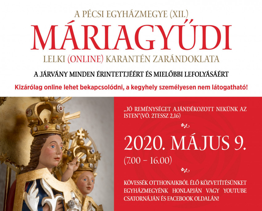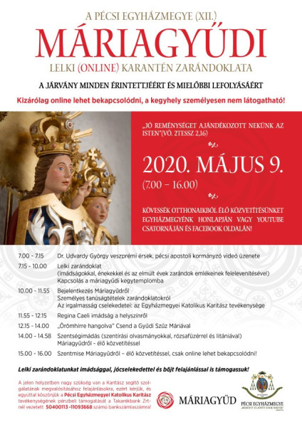 Nagy szeretettel hívjuk minden kedves testvérünket, hogy május 9-én csatlakozzanak az online közvetítés segítségével megvalósuló „karanténzarándoklatunkhoz”. Szinte egész napos élő adással jelentkezünk Máriagyűdről, amelyben felelevenítjük az elmúlt évek emlékeit, tartalmas beszélgetéseket hallhatunk, és ily módon lelkileg közel kerülhetünk a Máriagyűdi Szűzanyához.