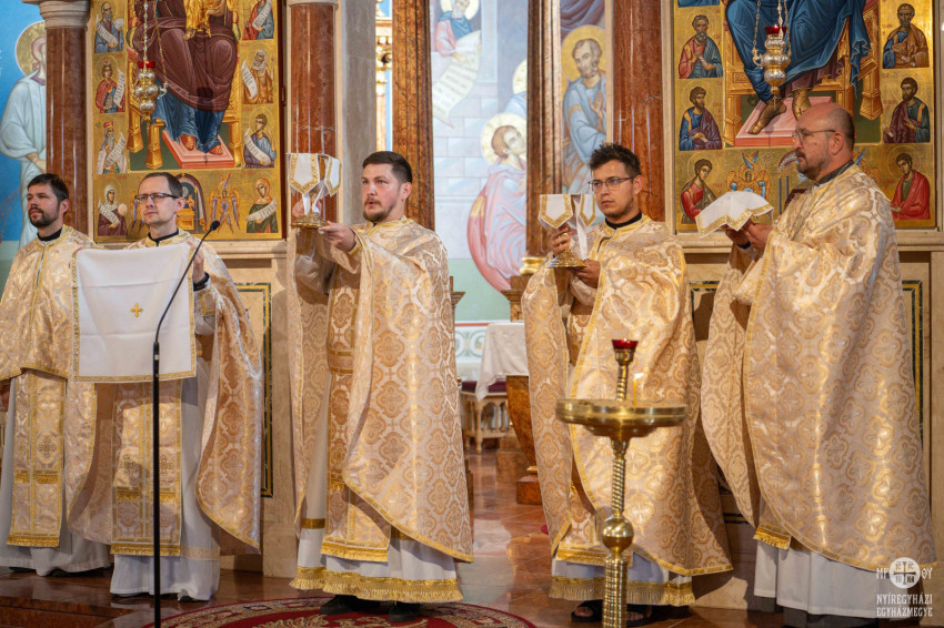 Szombaton reggel – Orosz Atanáz püspök jelenlétében – Szent Liturgiát végzett a székesegyházban Orosz István Mokiosz atya, mellette szolgáltak az oltár körül a zarándoklatba aktívan bekapcsolódó paptestvérek is.