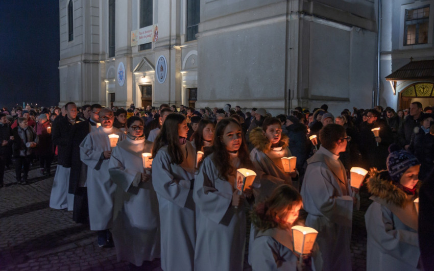 A gyertyás körmenetben a Szűzanya kegyszobrának másolatát szintén a csíksomlyói templom kórusának tagjai vitték.