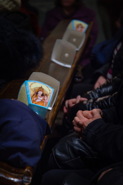 Az elsőszombati Mária-köszöntő kezdetén délután négy órától a gyimesvölgyi hívek, majd a csíksomlyói kegytemplom kórusának tagjai vezették az imaórát.