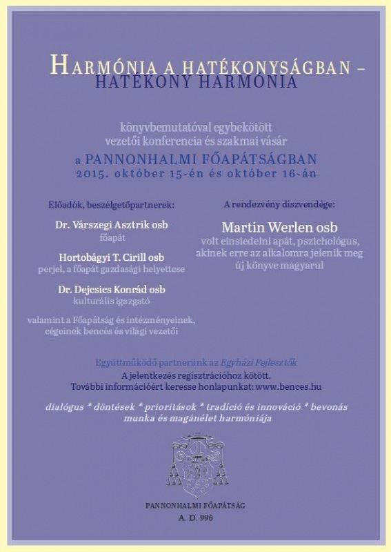 A Pannonhalmi Főapátságban idén Harmónia a hatékonyságban – hatékony harmónia címmel rendezték meg a vezetői konferenciát a főapátság és az Egyházi Fejlesztők közreműködésében. Martin Werlen mellett előadást tartott Várszegi Asztrik OSB főapát, Hortobágyi T. Cirill OSB perjel, a főapát gazdasági helyettese és Dejcsics Konrád OSB kulturális igazgató, valamint a főapátság és intézményei, cégei bencés és világi vezetői.