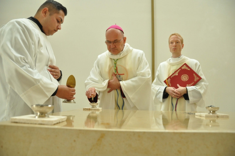 Ezt követően került sor az oltár felszentelésére, amelynek során a megyéspüspök a Mindenszentek litániáját követően elimádkozta a fölszentelő imát, majd krizmával megkente az oltárlapot. Ezt követte az oltár tömjénezésének szertartása, végül az új oltáron terítőt, keresztet és gyertyatartókat helyeztek el, amelyeken meggyújtották a Krisztus világosságát szimbolizáló gyertyákat, valamint kivilágították az egész kápolnát. Az Eucharisztia liturgiáját követően a püspök az Oltáriszentséget ünnepélyesen elhelyezve felavatta a tabernákulumot.