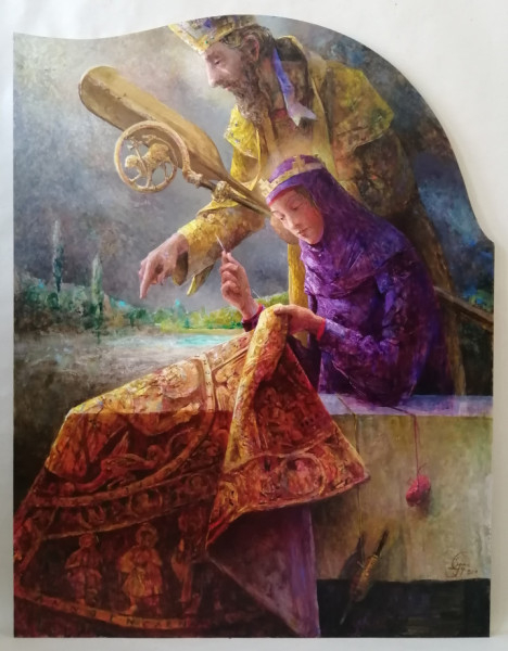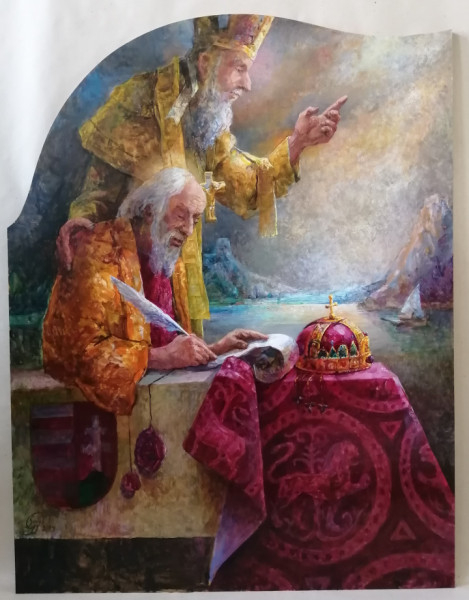 Ekkor előtűnt a Szent Imre szüzességi fogadalmát ábrázoló festmény, Zigány Hedvig (1870–1932) jeles festőművészünk 1906-ban készült színvonalas alkotása, amelyhez Pálos Frigyes kérésére Somos Gyula festőművész két kísérőképet festett, balról Szent István királyt, amint Szent Gellért püspök által ihletve írja fia számára az intelmeit, jobbról pedig Boldog Gizella királynét, aki Szent Adalbert püspök útmutatása szerint készíti a koronázási palástot 1031-ben.