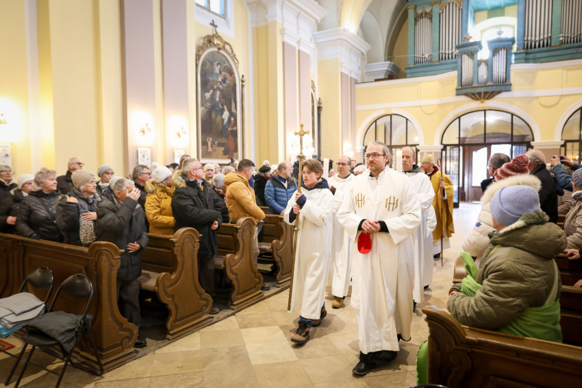Orgonaszóra, melyet a kivetítőn jeleztek, bevonult az asszisztencia és a papság, Nagy Sándor, a Katolikus Hallássérült Pasztoráció referense, a tabáni plébánia plébániai kormányzója és Martos Levente Balázs püspök.